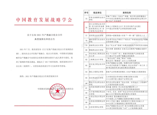受教育部职业教育与成人教育司委托,中国教育发展战略学会产教融合专业委员会遴选出485个产教融合校企合作典型案例,于3月24日正式公布。四川水利职业技术学院与四川省送变电建设有限责任公司、四川省电力企业协会携手报送的《技能人才紧缺怎么办?双元育训助产业发展!——混合所有制产业学院的构建与实践》成功入选典型案例。