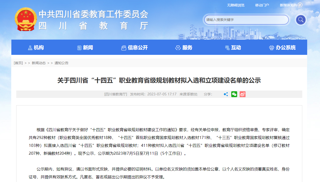 消息来源:关于四川省“十四五”职业教育省级规划教材拟入选和立项建设名单的公示