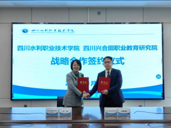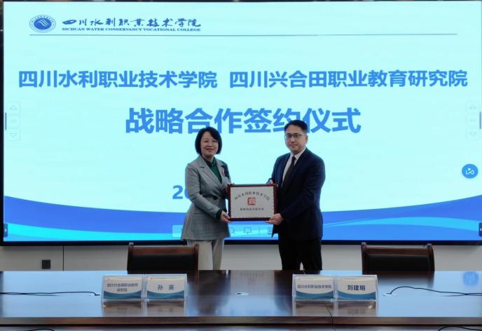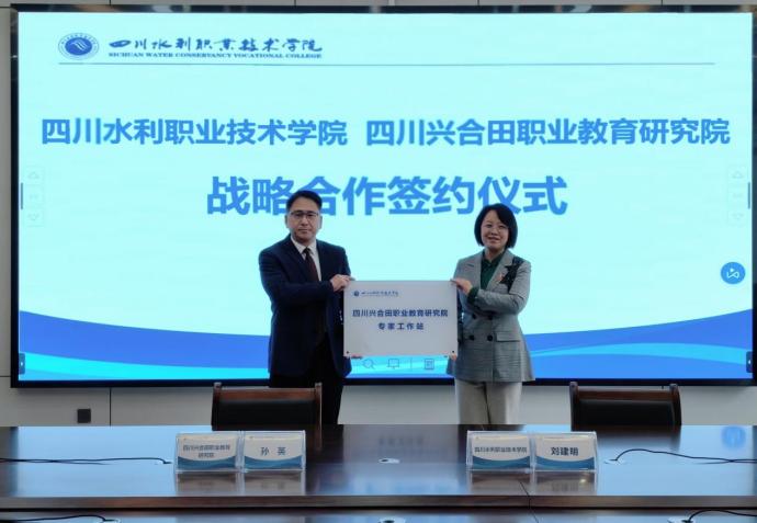 签约仪式上,双方回顾了过去一年来在职业教育高质量发展方法与路径的探讨与实践,并希望以此次签约仪式为契机,继续充分发挥各自在职业教育领域的办学与研究优势,在教学内涵建设上持续开展更加紧密的合作与探索,共同开展职业教育政策、职业院校治理体系改革、产教融合创新模式、人工智能背景下科教融汇等研究与实践;双方分别在其所在地挂牌“四川水利职业技术学院教师顶岗实践基地”“四川兴合田职业教育研究院专家工作站”,携手促进四川水利职业教育高质量发展。